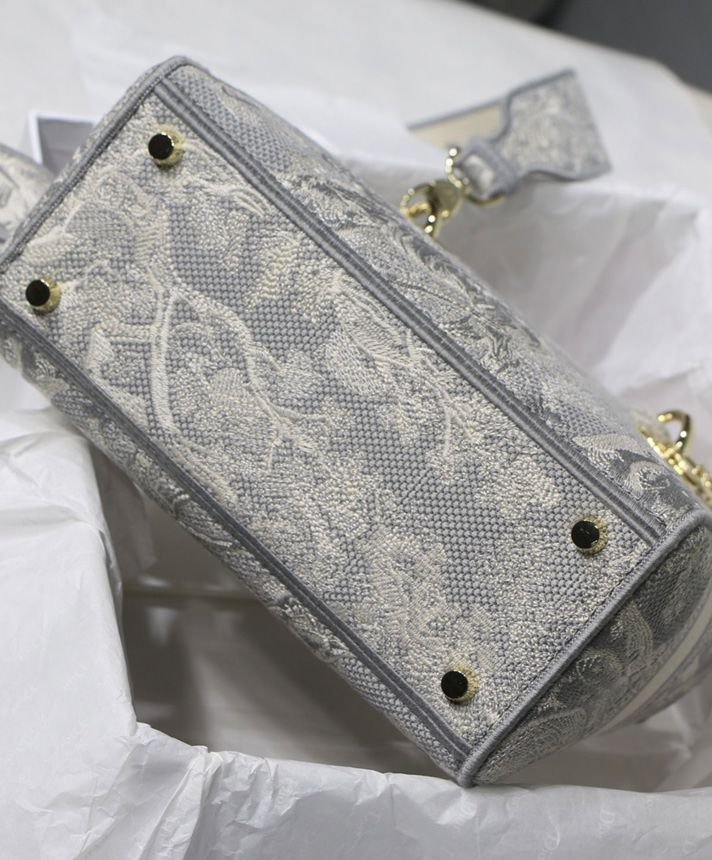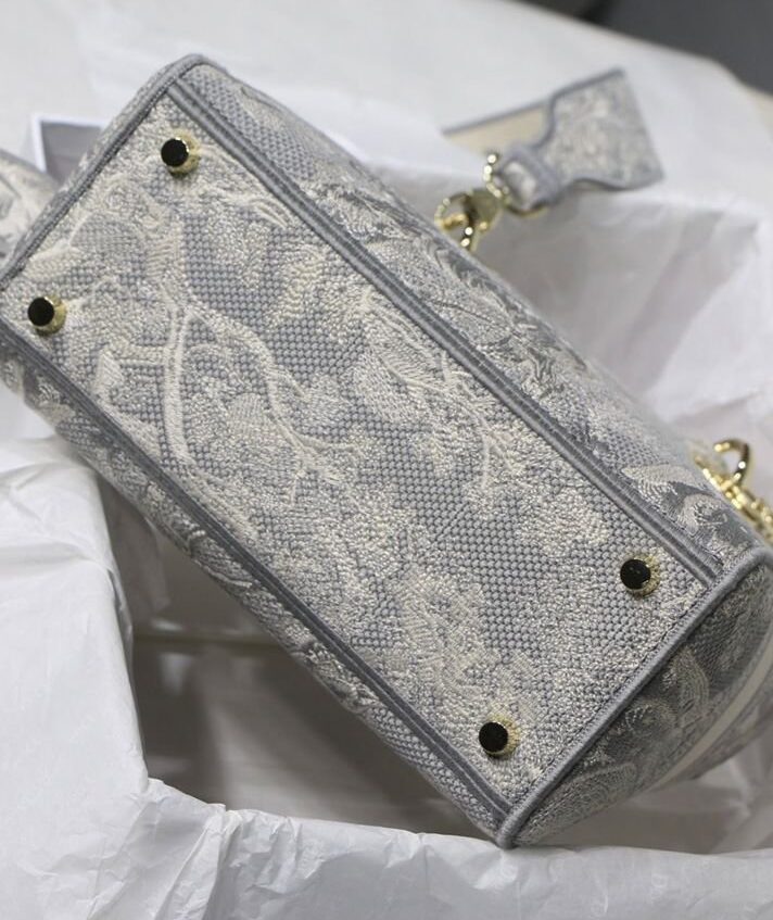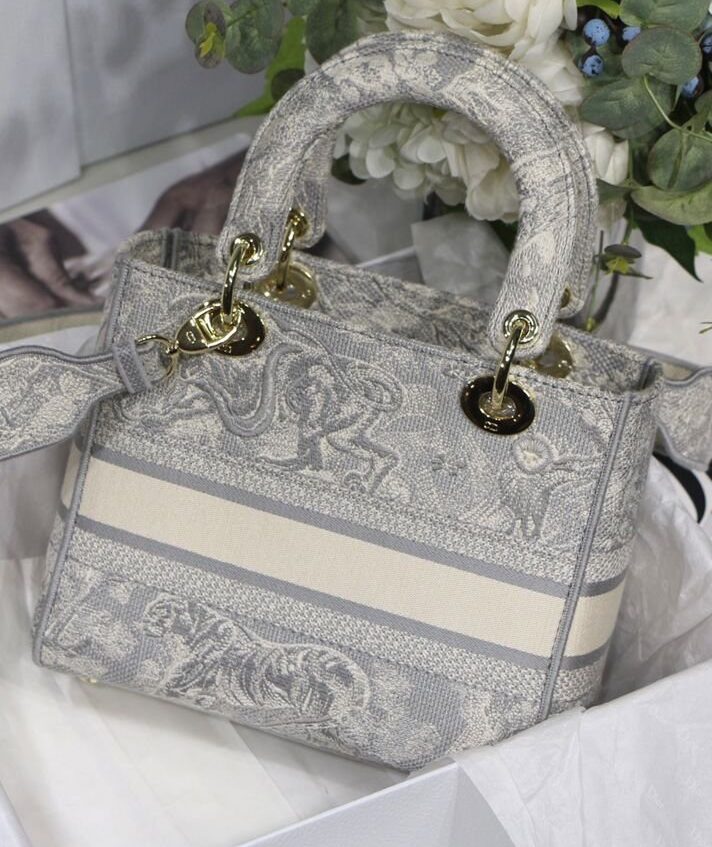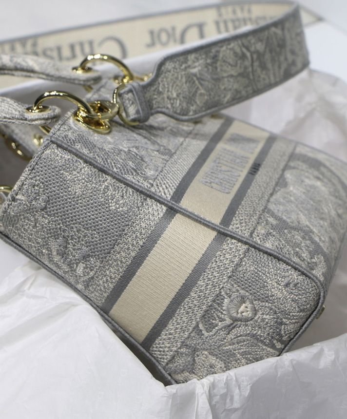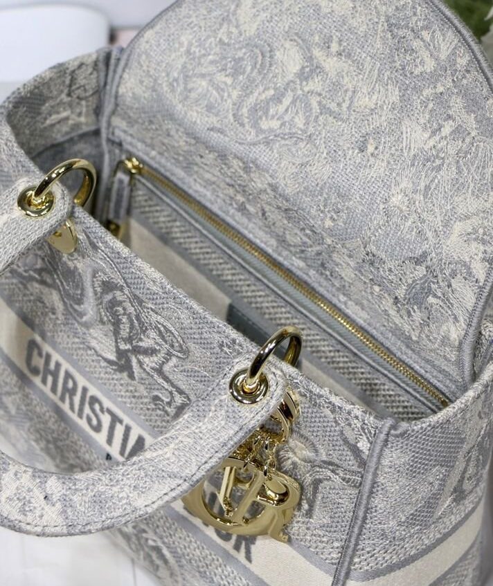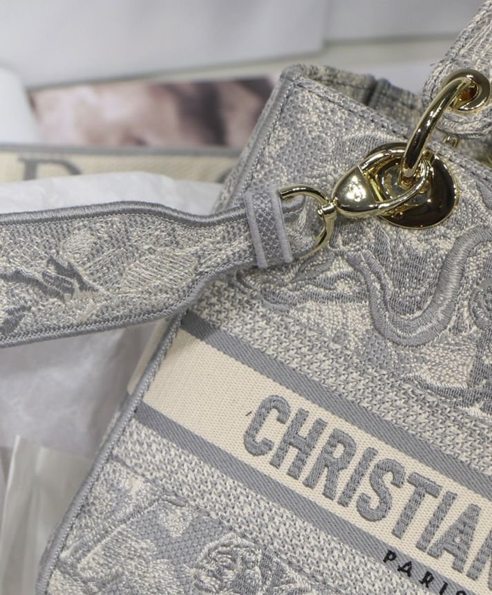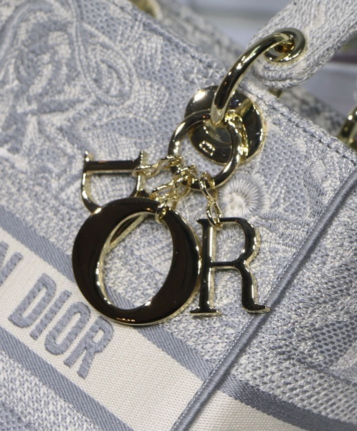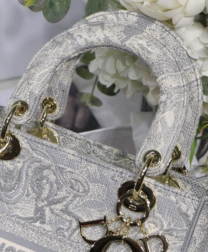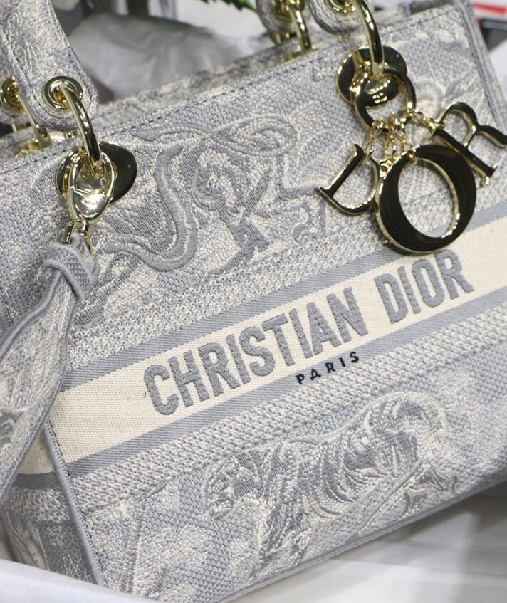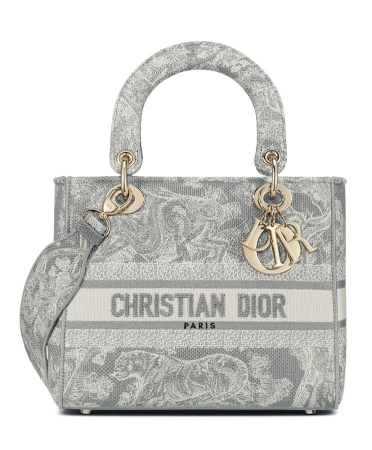 La borsa Lady D-Lite unisce l’eleganza classica alla modernità della casa. Il modello è completamente ricamato con il motivo Toile de Jouy Reverse, una variazione del motivo caratteristico della casa con un gioco di colori invertiti. Sul davanti è presente la scritta “Dior”, mentre il logo “DIOR” in grassetto è posizionato sul davanti. I pendenti realizzati in metallo color oro chiaro sottolineano la silhouette. Dotata di un’ampia tracolla ricamata, reversibile e removibile, la borsa Lady D-Lite media può essere portata a mano, a spalla o a tracolla.