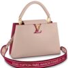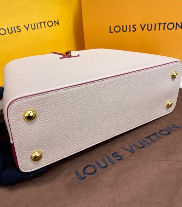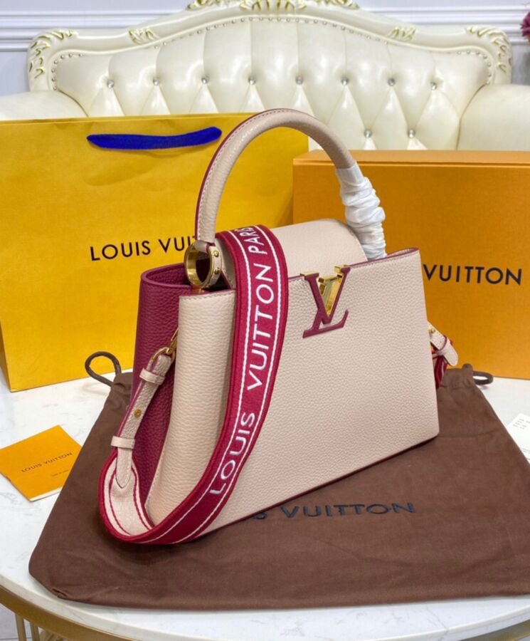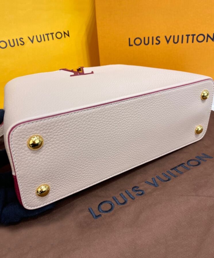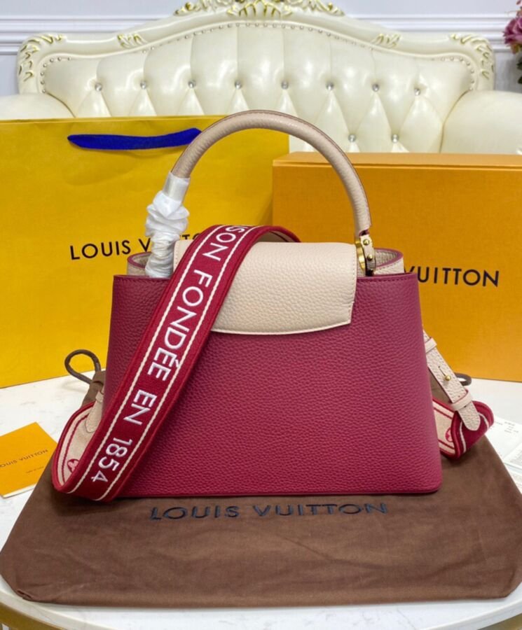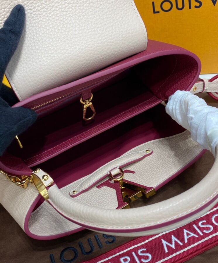 Blocchi di colore a contrasto sul davanti e sul retro e un cinturino in tessuto ricamato con fiori Monogram su entrambi i lati aggiungono fascino a questa borsa Capucines MM. L’elegante tracolla larga, perfetta da portare a spalla, aggiunge un tocco di stile moderno alle linee classiche della borsa. Il manico superiore in pelle e le iniziali LV completano il quadro.