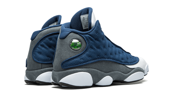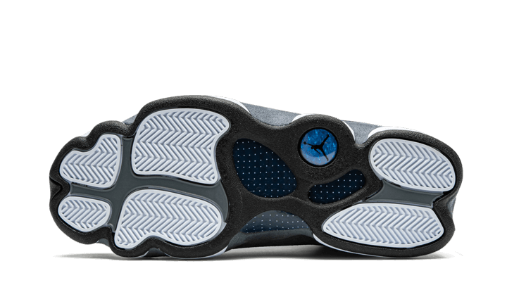La Air Jordan 13 Retro Flint (2020) est composée d’un upper majoritairement composé de maille bleu denim laissant apparaître un revêtement réfléchissant. La toebox et la languette en cuir blanc apportent du contraste pendant qu’un empiècement en suede gris partant du talon et allant jusqu’au au garde-boue, apporte de la structure au design. Le tout est finalisé par un Jumpman bleu ciel au niveau de la languette, l’incontournable hologramme sur les côtés extérieurs et des mini languettes à la base des lacets avec l’inscription «Jordan» en lettres capitales.