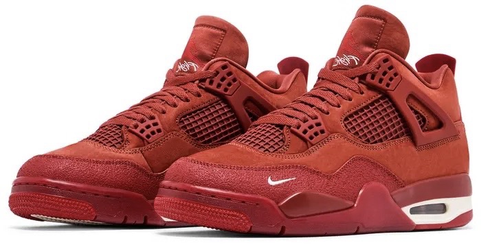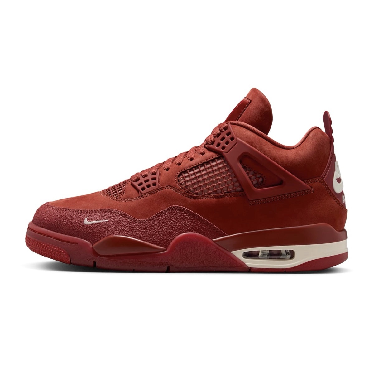 La Nigel Sylvester x Air Jordan 4 Retro OG SP ‘Brick By Brick’ presenta una tomaia in suede monocromatico nella tonalità Firewood Orange e include dettagli iconici, come la rete sui pannelli laterali, occhielli modellati e ali di supporto in TPU.