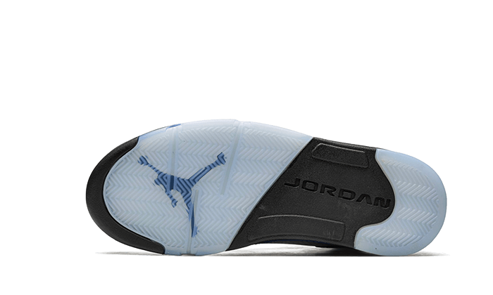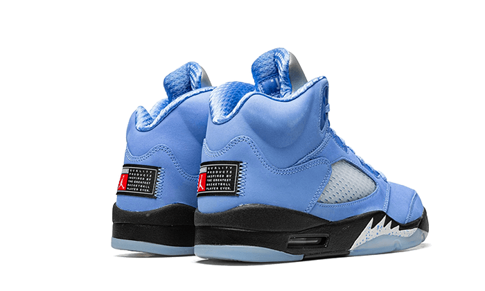 The Air Jordan 5 UNC features an upper in university blue nubuck in reference to the former University of Michael Jordan located in Chapel Hill . The faithful TPU cage is well present in its translucent outfit in keeping with the outsole. A black midsole matches the branding on the heel while the shark teeth on the sole comes in a white shade accompanied by spots blue. Inscriptions “Heart” and “Soul” inside the tabs wrap it all up.