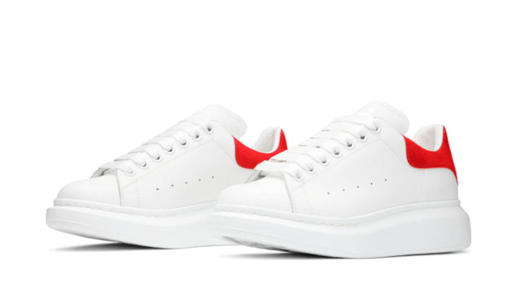 Sneaker stringata in vitello bianco liscio con punta arrotondata e rifinita con dettaglio tallone in suede nero. Lacci larghi piatti e firma Alexander McQueen sulla linguetta e sul tallone. Suola oversize in gomma.