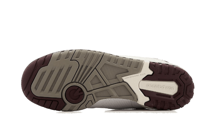 La New Balance 550 Burgundy Cyan presenta una base in pelle bianca traforata con dettagli bordeaux sul colletto e sul marchio. Ci sono accenti turchesi sul logo 550 e intorno al marchio. Una suola grigia, bianca e bordeaux completa il look.