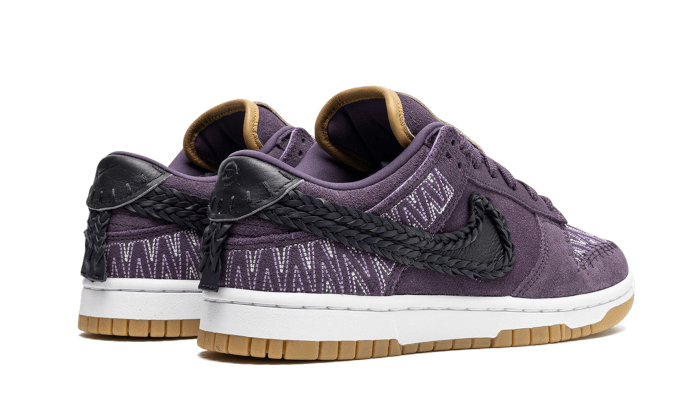 There Nike Dunk Low N7 Displays a rod beefy color grape with contrasting seams and stitching, as well as a Swoosh central and heel panels in black leather finishes braided, references to Amerindian art. The mention the reference N7 and the wording “Design for 7 generations “appear at the level of the laces in a tag chestnut, to which the gumsole and one deubred.