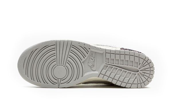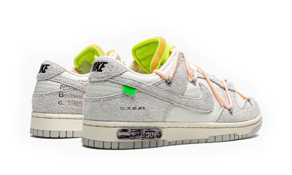 La Off-White x Nike Dunk Low Lot 12/50 una delle cinquanta colorazioni della scarpa da basket retr creata da Virgil Abloh e Nike nell’agosto 2021. La collezione Off-White x Nike Dunk Lot 50 segue l’ambita collezione del duo Collaborazione “The 10” del 2017 che ha visto Abloh ricreare colorazioni decostruite degli iconici modelli Nike e Air Jordan. In “Lotto 12”, la tela della vela appare sulla punta, sul pannello centrale e sul colletto. Le sovrapposizioni e lo Swoosh sono realizzati in pelle Neutral Grey. Il marchio “Nike” nero stampato sul tallone e la scritta Helvetica di Off-White si trova sul lato mediale. Un sistema di allacciatura secondario simile a un cordino elastico viene aggiunto alla tomaia oltre a una configurazione di allacciatura tradizionale. Il look ripreso dalla prima collaborazione Nike Dunk di Off-White del 2019. Un inserto rosa e nero marmorizzato con “Lot 12 of 50” appare sull’intersuola Sail.