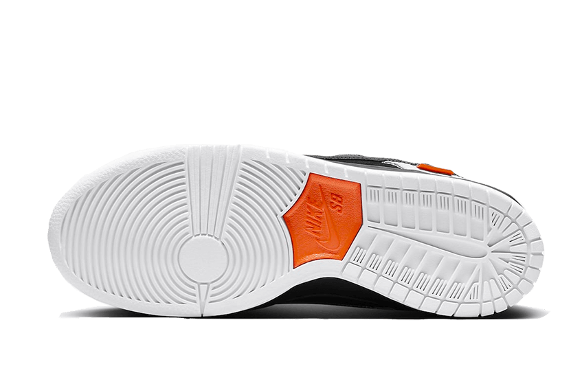 Questa Nike Sb Dunk Low Sventura presenta una base in camoscio nero, accompagnato da sovrapposizioni in pelle bianca testurizzata con motivi che ricordano scanalature. Di Pelle liscia grigia veste il Swoosh al finitura riflettente su cui è appesa un’etichetta orange Contrassegnato dalla menzione “sventura” che si trova anche sulla lingua.